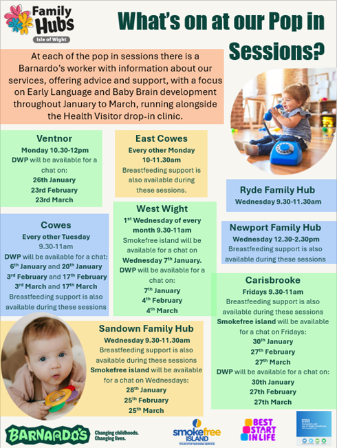 Β  Our Family Hub pop-ins run at select centres on set days.At each of the pop in sessions there is a Barnardo’s worker with information about our services, offering advice and support, the sessions run alongside the Health Visito ...